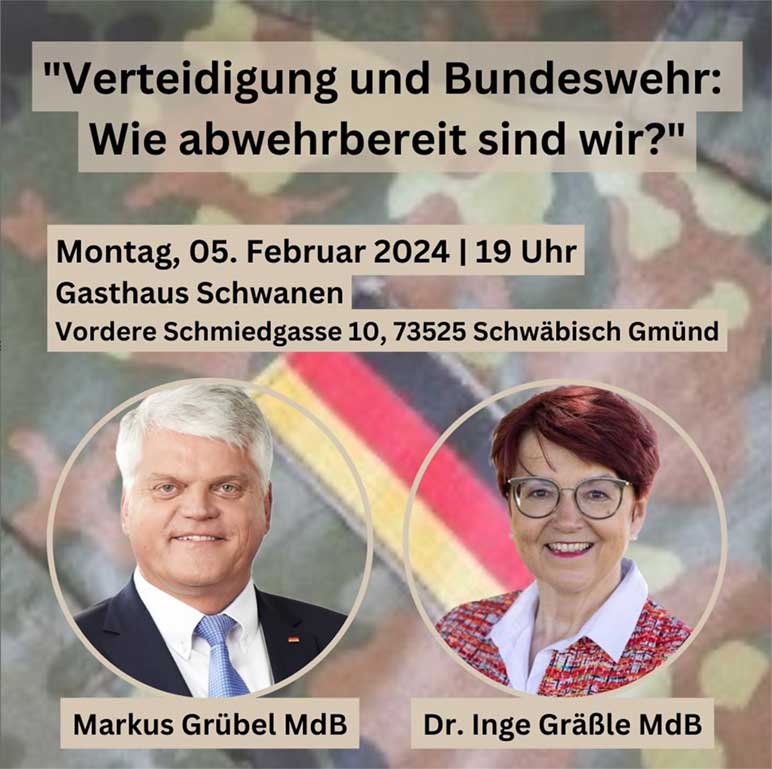 Unter dem Motto „Verteidigung und Bundeswehr – wie abwehrbereit sind wir?“ lade ich Sie zu einem Vortrag mit anschließender Diskussion ein. Als Redner konnte ich einen ausgewiesenen Fachmann gewinnen: meinen Esslinger Bundestagskollegen Markus Grübel, ehemaliger Parlamentarischer Staatssekretär im Bundesverteidigungsministerium, Reserveoffizier der Marine und Mitglied im Verteidigungsausschuss des Deutschen Bundestages.